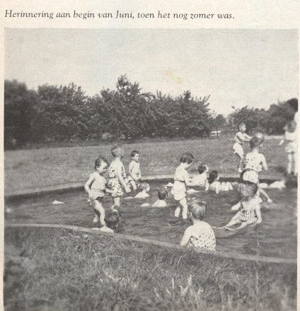 De oude zwembad stond voor carillon s gebouw. Het was jaar of 1962. De kleuterklas van de groepleidster Conny Franken. Ans- Diana-Leentje-Dorine-Avyola- Dre-Eddy-Harry-Roel-Juup zaten in het zwembadje.