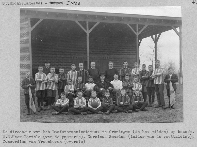 Hallo Jan Jonkman. Hieronder schreef je dat komt het juist dat ik nog goed herkend van de lokatie die voor de voetballersonder de schuil houden bij het slechte weer. Verder mij vraag! Midden van de omringd de jongens zat de groninger directeur van het doofstommeninstituut. Die heet hij W.E. Heer Bartels oja daar stond de links een priester die heet ook Mhr Bartels de priesterleraar van ivd St Michielsgestel. En de rechts naast van Br Corsinus de overste Br Concordius dat hij zo pas benoemd als de overste van de Broeders en daarna Br Geogerius in 1932 tot met 1938 wordt opgevolgd aan Br Cheophas.