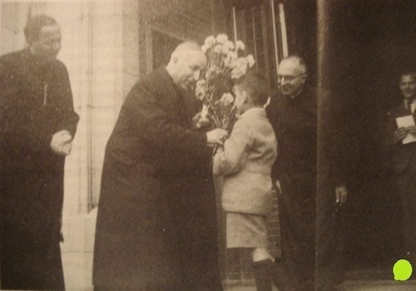 Frans Rijnbout, deze foto zeer waarschijnlijk gemaakt in 1943 tijdens de eerste bezoek van de nieuw-benoemde bisschop Mutsaerts van Den Bosch aan het instituut. Hij verving de oud-bischop Mgr. van Diepen na zijn overlijden. Bij de hoofdingang werd deze nieuwe bisschop Mutsaerts verwelkomd door Mr. Directeur van Overbeek en Mr. v. Lierop. De negenjarige Fransje van Boxtel(ov.) gaf de nieuwe bisschop Mutsaerts een bos bloemen namens de jongensafdeling. De andere bos bloemen die de nieuwe bisschop in zijn linkerhand vasthield, zou zeker aangeboden gekregen door één van de meisjes, namens hun meisjesafdeling en daar was geen foto van gemaakt. Deze foto werd meermalen geplaatst in ,De Vriend der Doofstommen' als jaarverslag in die tijd, dus in de bezettingsjaren.