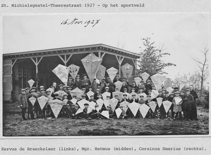 Lezers, wat een vreemd gezicht op de bovenstaande foto. Iedereen op de foto hadden een verplichte hoofddeksel en allemaal hetzelfde petten. Het was één groep jongens, groot en klein met Br. Corsinus als groepsleider. Niet allemaal hadden ze vliegers van verschillende formaten. Hadden ze toen heel weinig te doen in hun vrije tijd dan vliegeren, dan wandelen of voetballen. Zeker was voetbal op het instituut in beginstadium, want de lokatie op de achtergrond waren zeker gereedgekomen en geleverd. Hierover had ik eerder over dat gebouw verteld in lognr.222(Directeur uit Groningen op bezoek bij IVD rond 1926). Het gras aan de voorgrond was gewoon een weiland en deze moest nog verwerkt worden tot een sportveld met ander grassoort. En dat weiland moest eerst omgeploegd worden.Op de achtergrond tegen de beplanting stond nog geen muur van betonplaten.